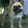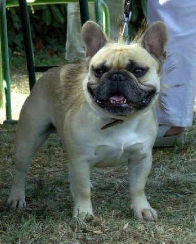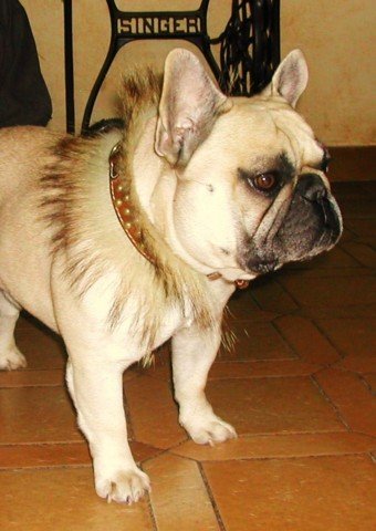 | Ce bouledogue Français porte un collier en cuir et poils de blaireau |