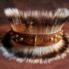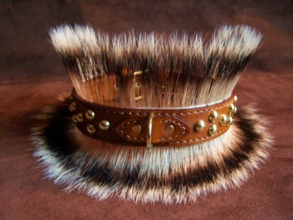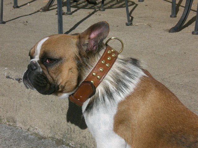 Petit Bouledogue Français avec un collier en cuir et clous de garniture en laiton massif et poils de blaireau.