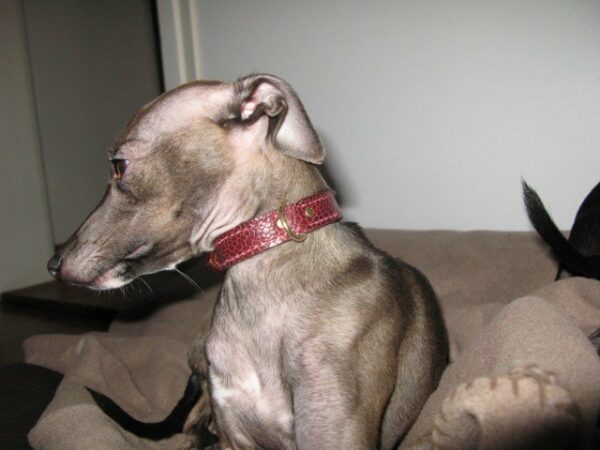 Jolie Whipett qui porte un collier en patte d’autruche