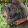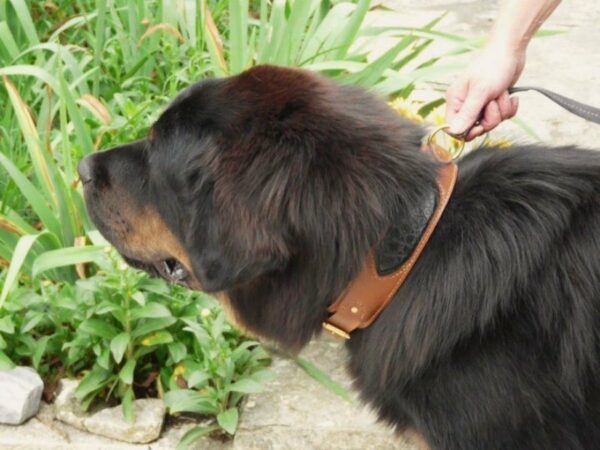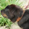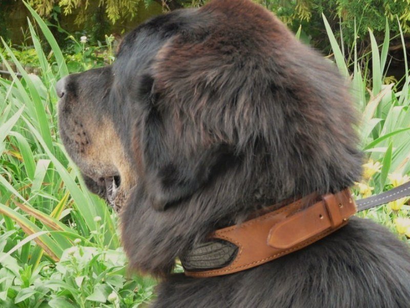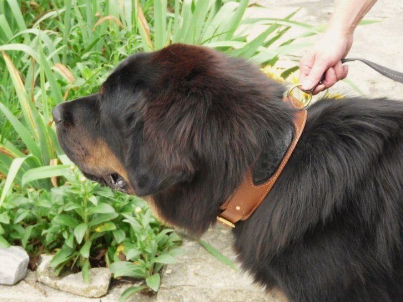 Un beau dogue du Tibet portant un collier en cuir et croco.