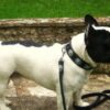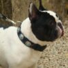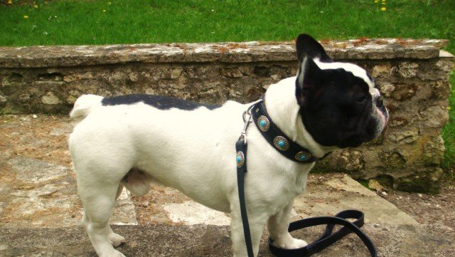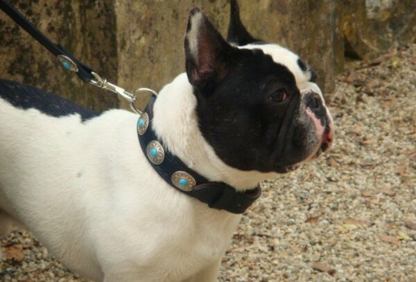 | Ce bouledogue Français porte un collier « mexicain » avec sa laisse assortie |