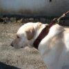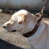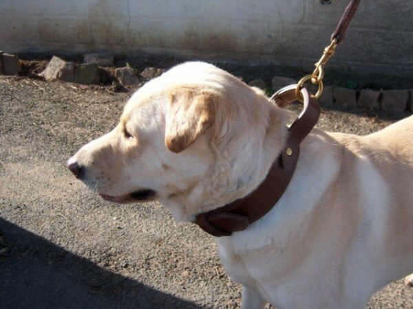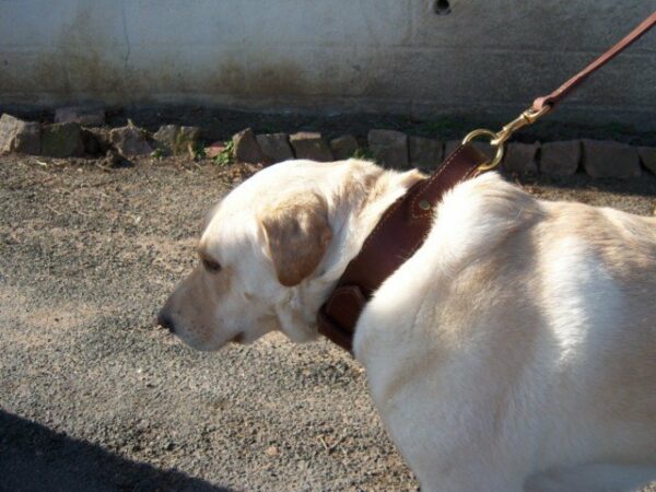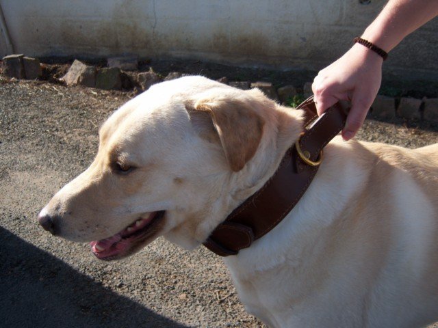 | Il porte un collier en cuir , avec poignée et laisse assortie |