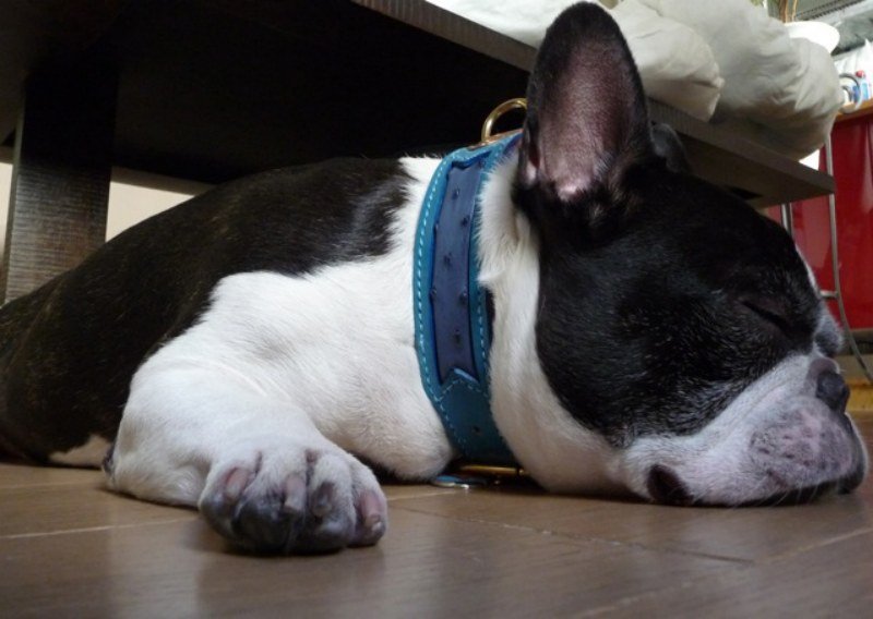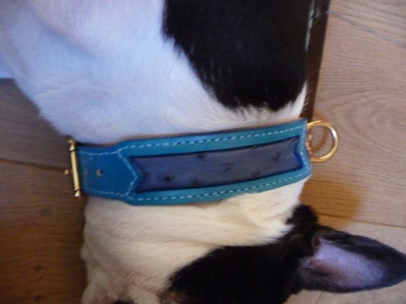 | Il porte un collier en cuir et peau d’autruche. Le collier a était modifié. Nous avons augmenté la largeur. De 2,5 cm, nous sommes passé à 3,5 cm. |